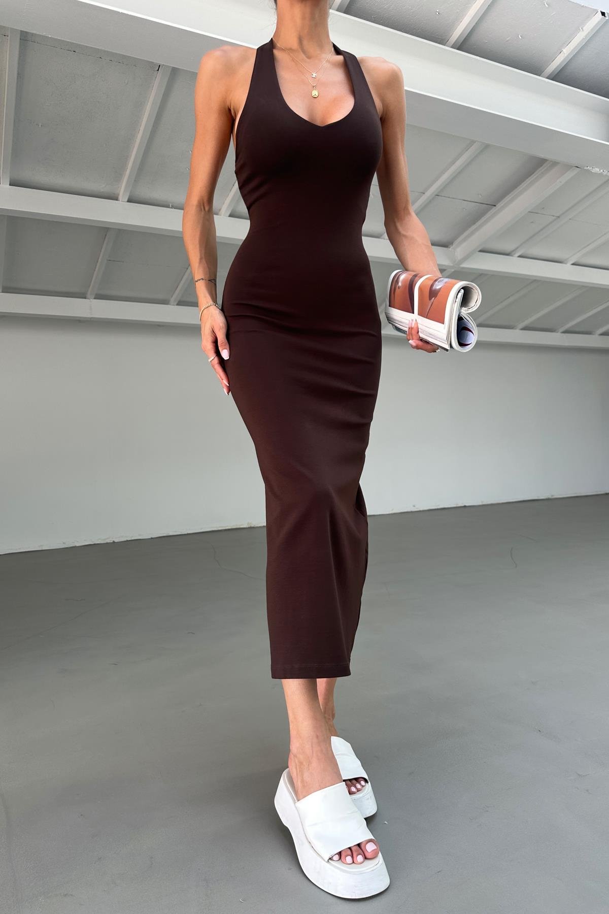 Boyundan Bağlamalı V Yaka Uzun Elbise Kahve (281227)