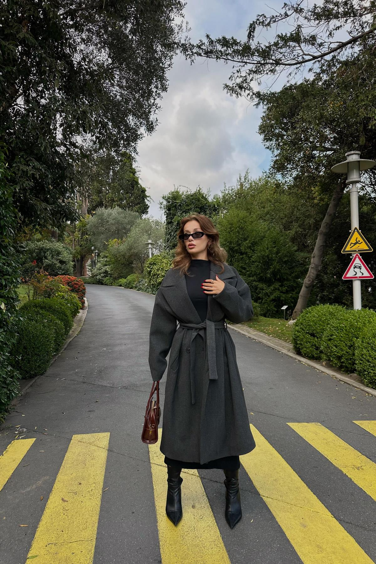 Çift Düğme Kuşaklı Kaşe Kaban Antrasit