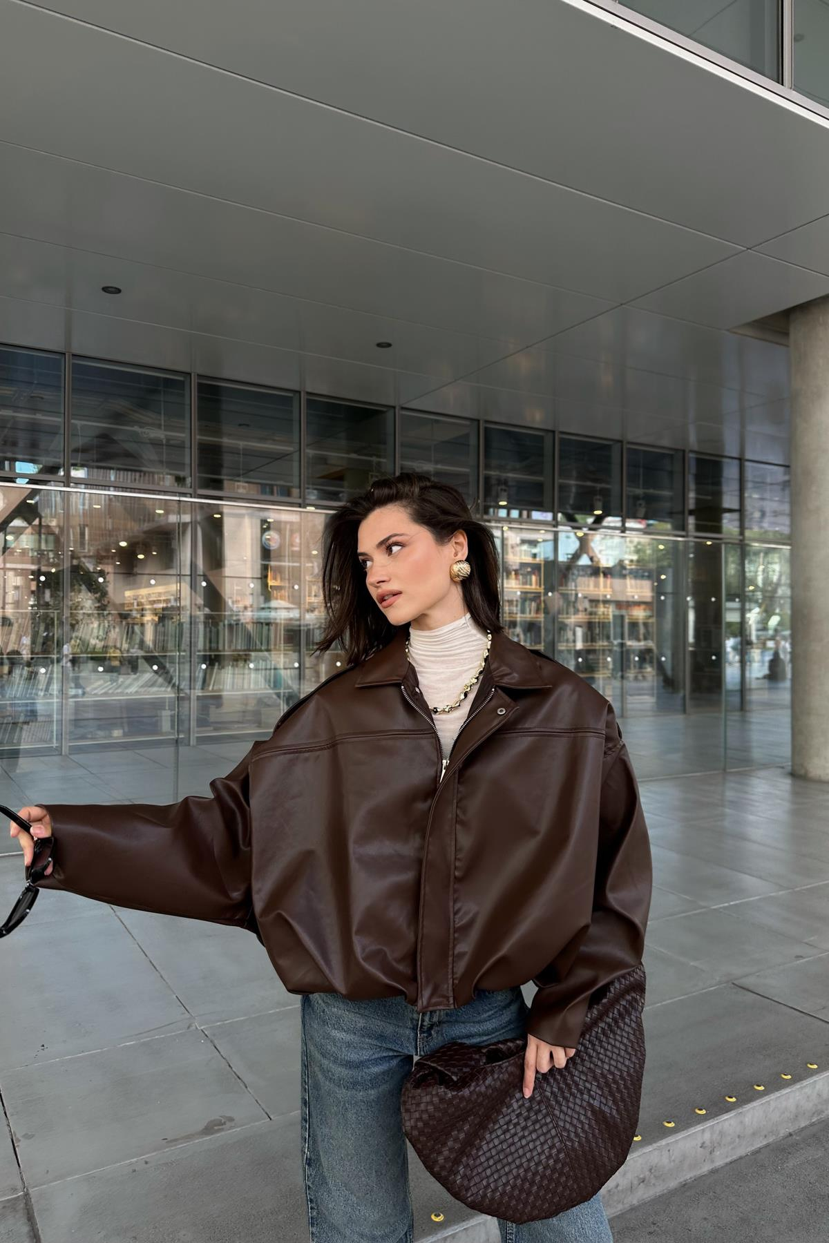 Fermuarlı Premium Deri Mont Kahverengi (23291)