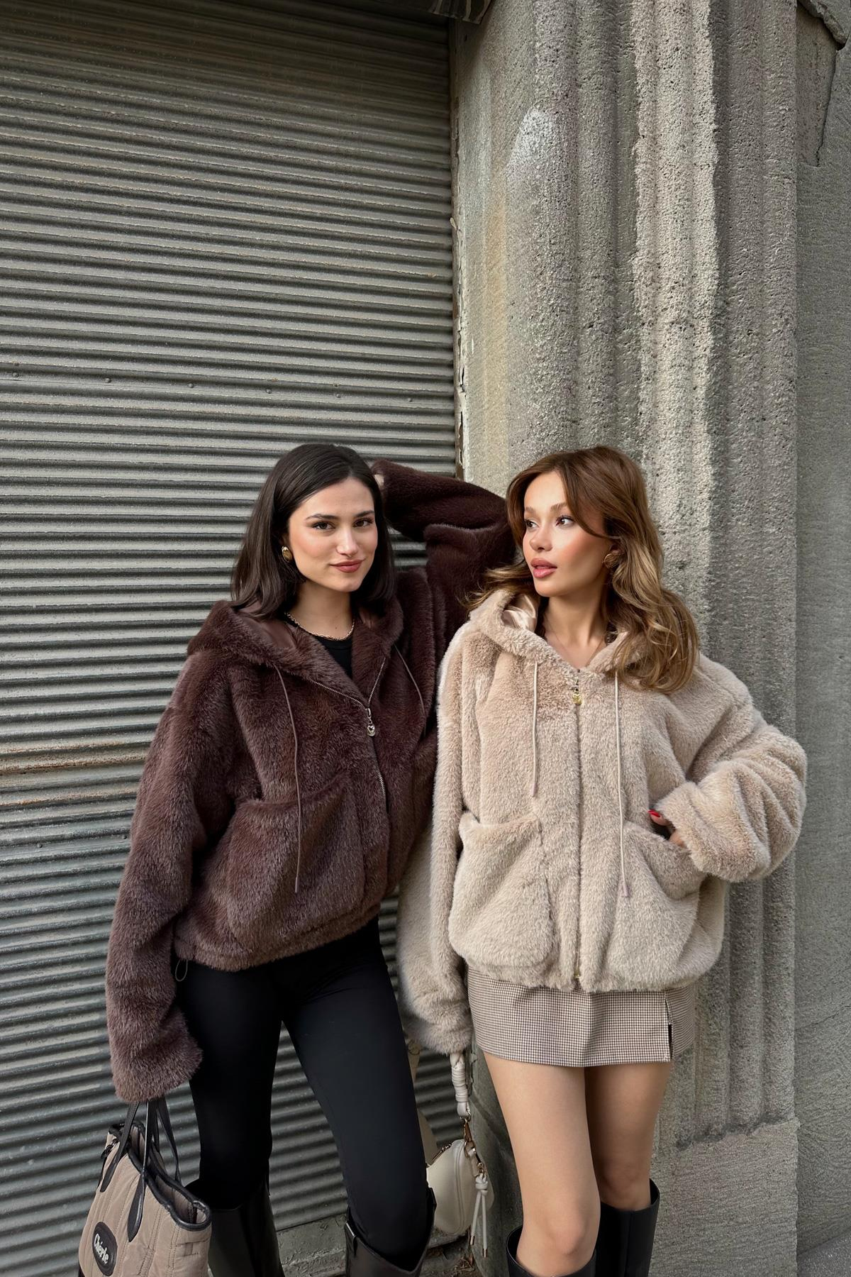 Kapşonlu Kısa Kürk Mont Bej (19188)
