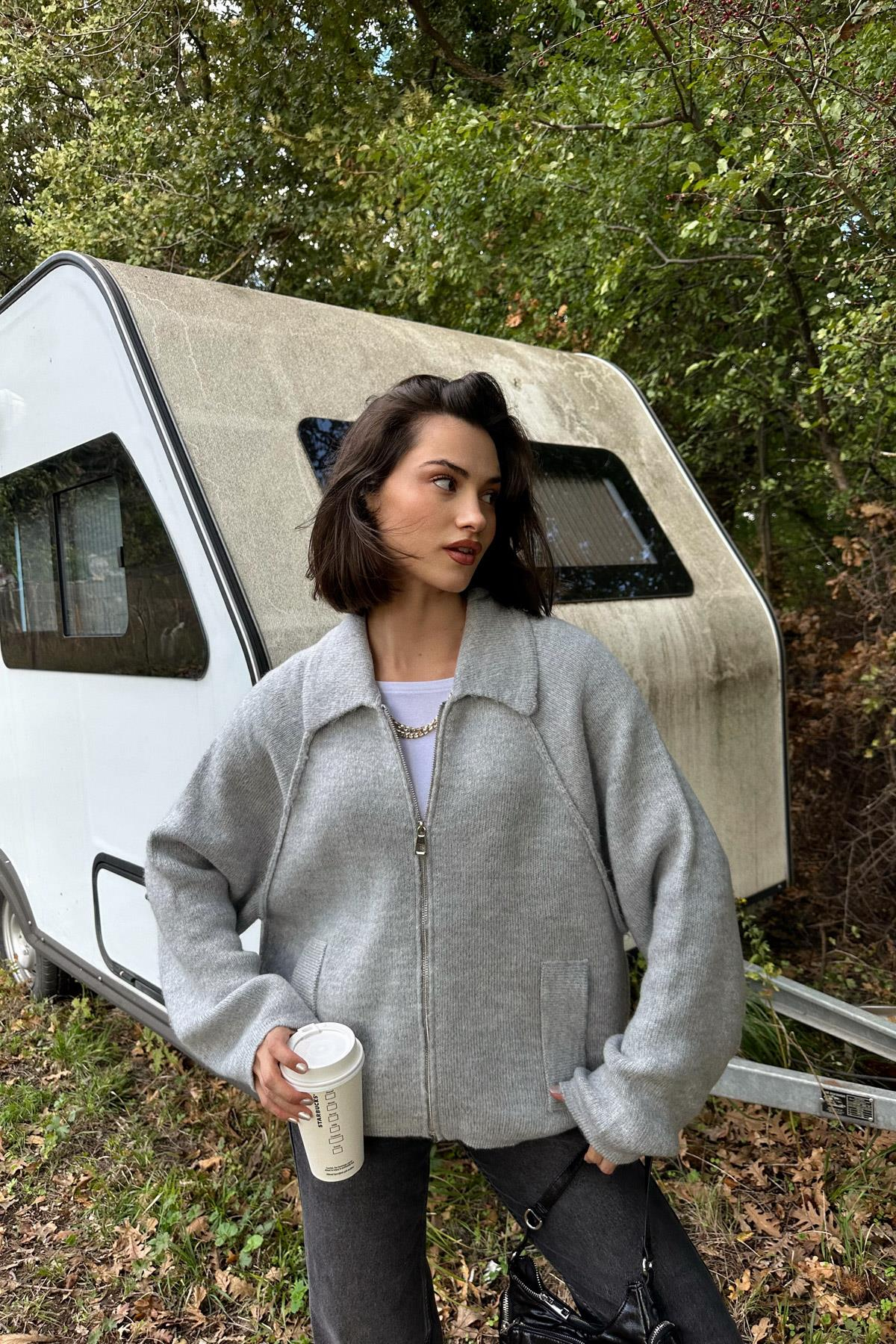Polo Yaka Fermuarlı Hırka Açık Gri