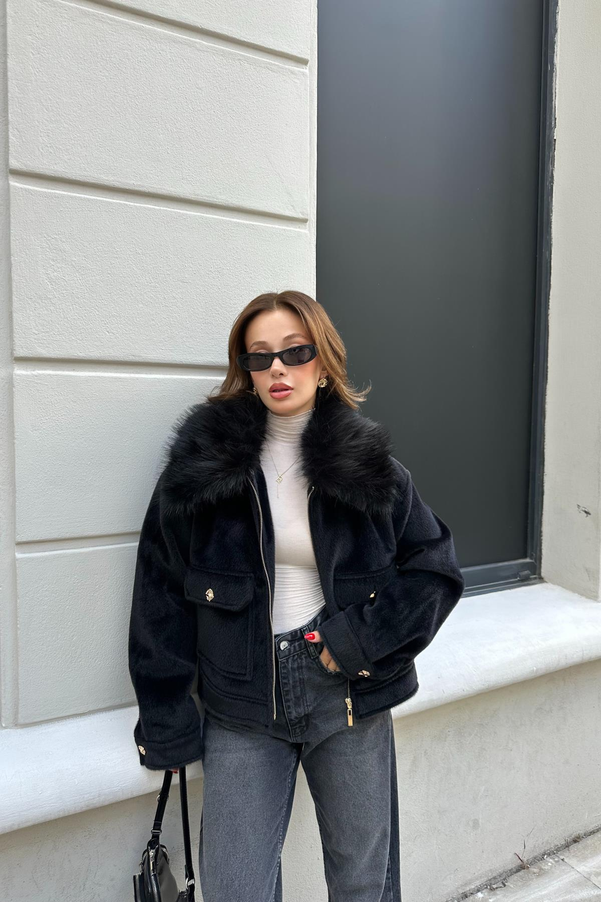 Yakası Kürklü Premıum Kısa Kaban Siyah